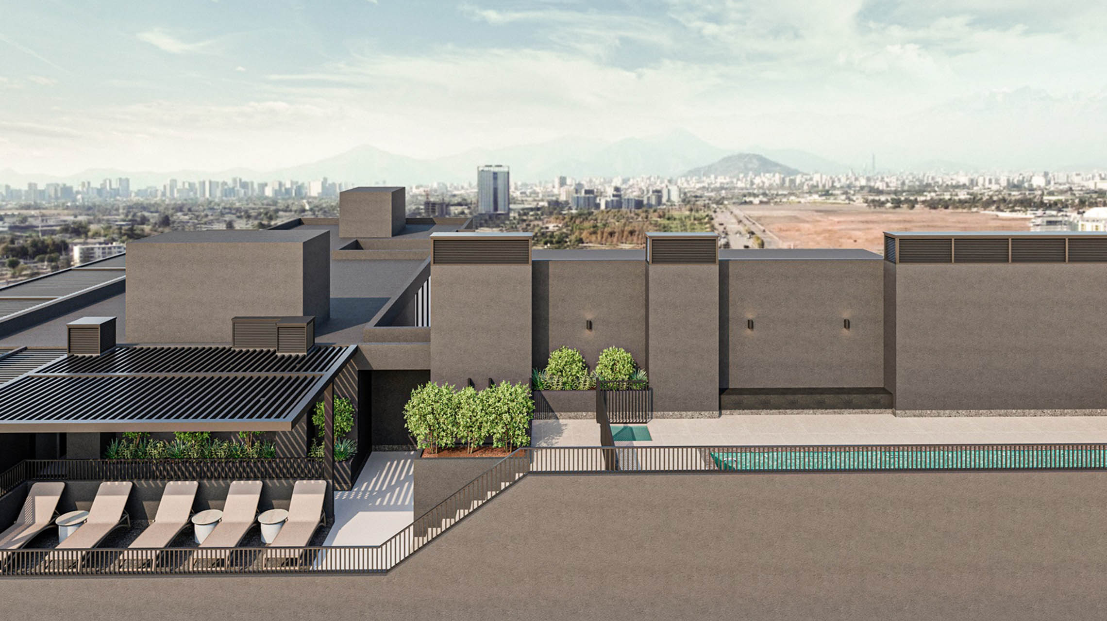 Hall de acceso con conserjería las 24 hrs, Lavandería, Gimnasio equipado, Petzone, Sky Bar, Quinchos Panorámicos, Patio Central, Salón Gourmet, Salón Cowork, Piscina Panorámica